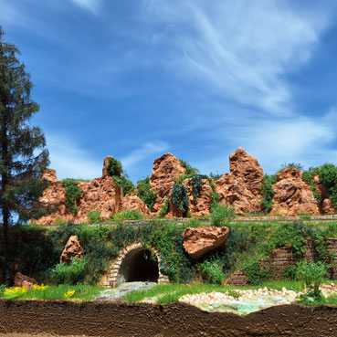 Spachtelmasse sowie auf fortgeschrittenen Techniken zur Erstellung und Farbgebung von Felsen. Es werden fertige Felsstücke integriert, die